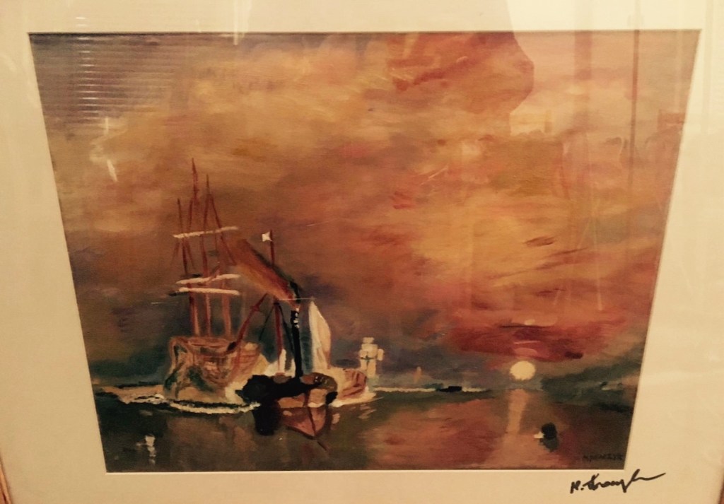 “After Turner – Sunset Harbour (Copy)” is an oil painting lovingly recreated by the artist as a tribute to the luminous seascapes of J.M.W. Turner. The scene shows sailing ships resting on still water while the sky burns with reds, golds, and soft violets, dissolving the line between sea and sky. Loose, energetic brushstrokes suggest movement in the clouds and water, while the glowing sun near the horizon anchors the composition with a calm point of light. This copy preserves the drama and poetry of Turner’s vision yet carries the unique touch of the artist’s own hand, making it a warm, nostalgic centrepiece for any room.
