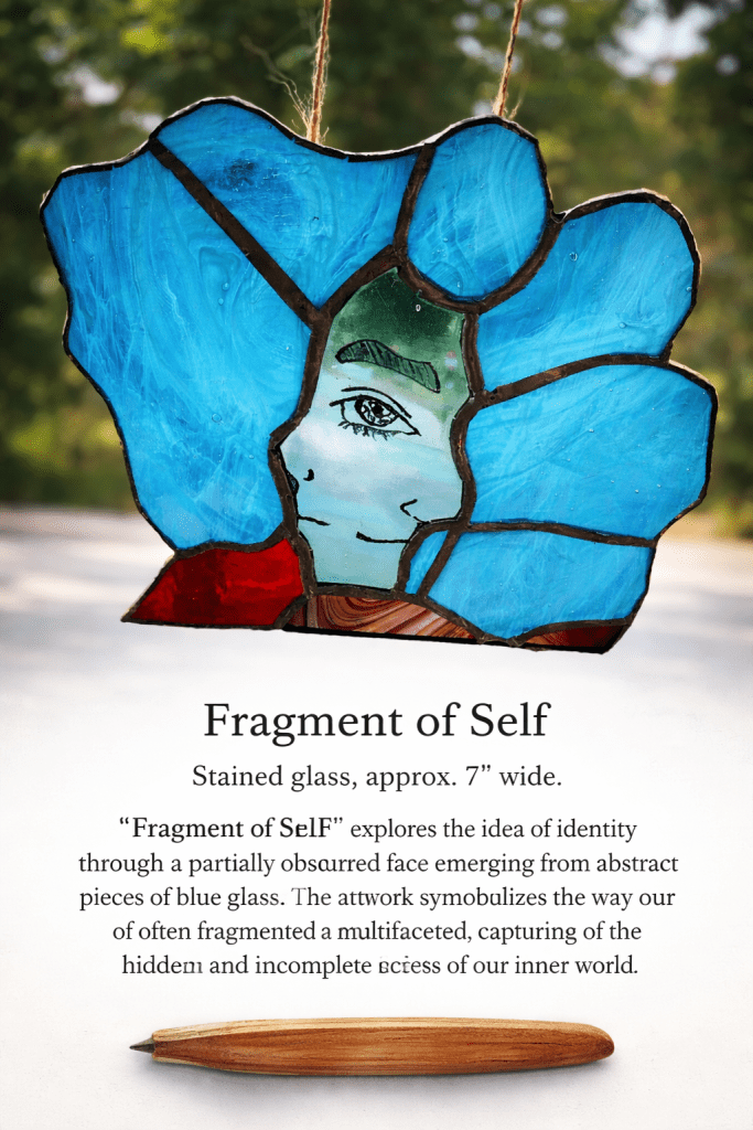 The single visible eye becomes a focal point of awareness, confronting the viewer while remaining embedded within the fractured whole. It suggests presence, but not full disclosure — a tension between what is seen and what remains withheld.