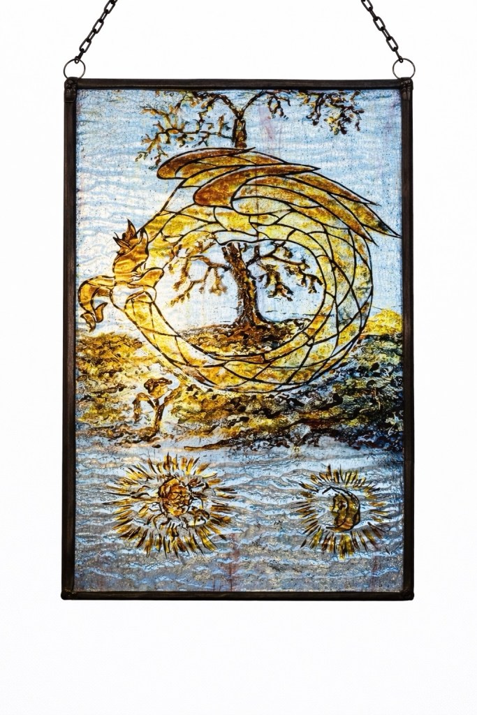 On this glass panel, a dragon emerges from swirling mist like a guardian between two worlds. The golden line dividing the composition is a gate, a threshold that cannot be crossed without courage. On one side there is still chaos and shadow; on the other, a space of light begins, into which the dragon leads only those who dare to trust their own inner strength.