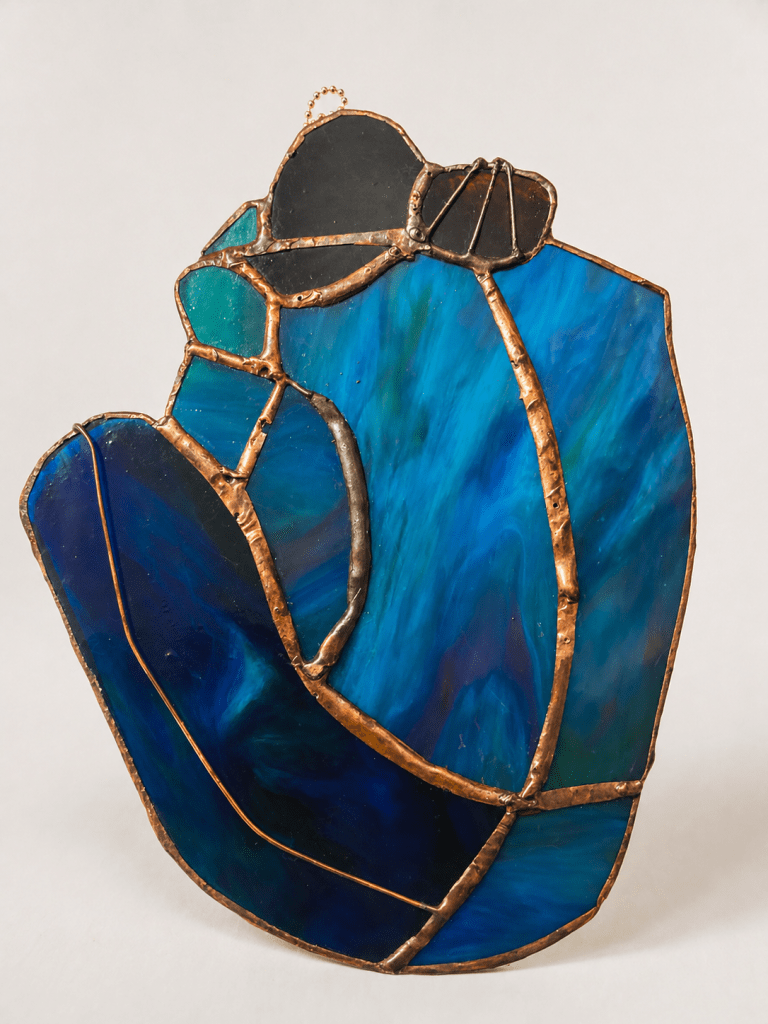 Deep blue fields shift in tone and density, activated by light and the viewer’s position. The copper framework does not simply bind the form; it interrupts, redirects, and stabilises — creating a dialogue between fragmentation and coherence.