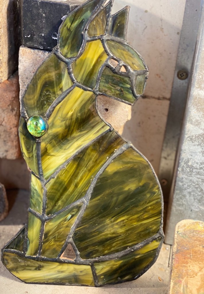 Every curve of this cat was cut by hand from iridescent green glass that shifts from emerald to amber as light moves across it. Each piece was wrapped in copper foil tape, soldered with precision for strength, and polished to a gleam. Her eyes catch a spark of life, and the flowing lines of her body give her a regal, standing pose – elegant yet wild, like a guardian of the night. Completely one‑of‑a‑kind, she glows with quiet confidence.