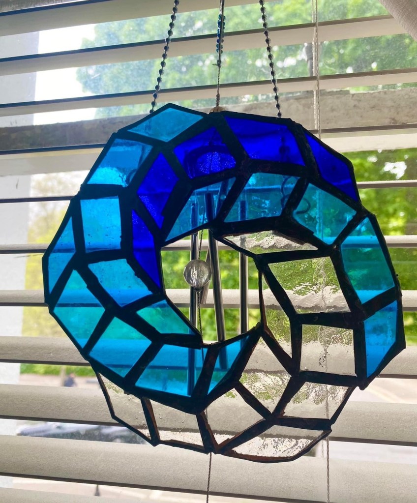 This piece was a pure experiment with copper foil soldering – the classic method used by Tiffany himself. I started with a simple idea: what if I made a Mobius strip, that endless loop that flips inside out? I cut dozens of tiny blue glass squares and triangles, wrapped each edge in copper tape (sticky, fiddly work!), and soldered them together on a flat board. Halfway through, it started to lift and twist into three dimensions, which was both terrifying and exciting – would it hold? With careful heat from the iron and a lot of flux, the spiral locked into place. Now it hangs in the window, endlessly turning sunlight into deep aquamarine rivers. It’s a reminder that the best art often comes from playing with shape until it surprises you.