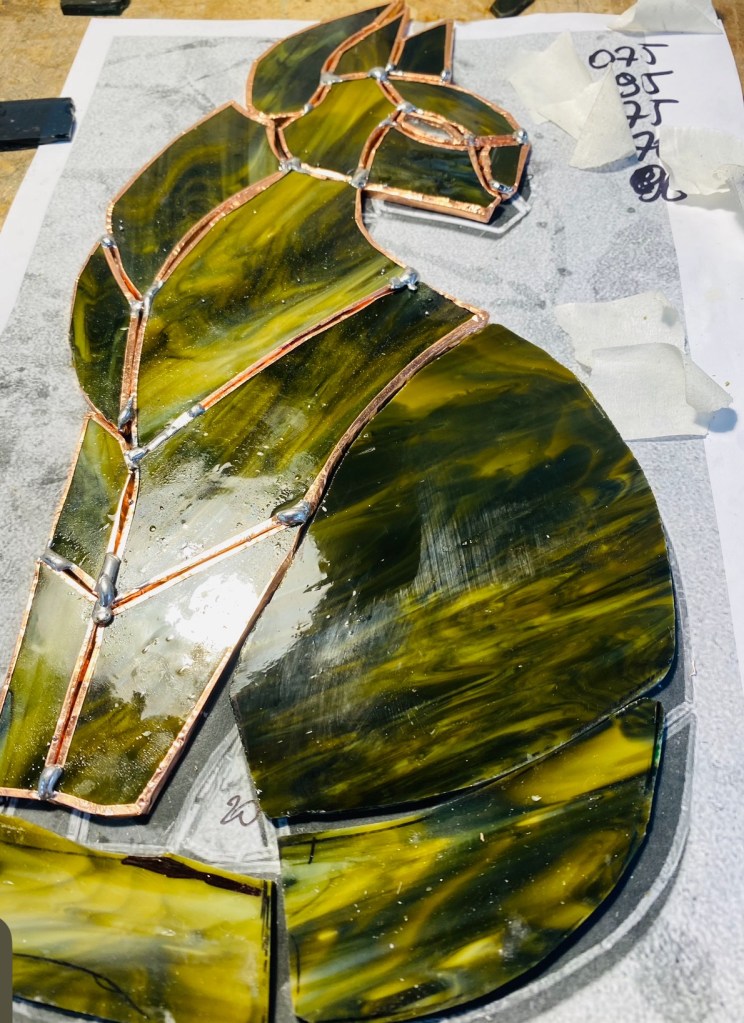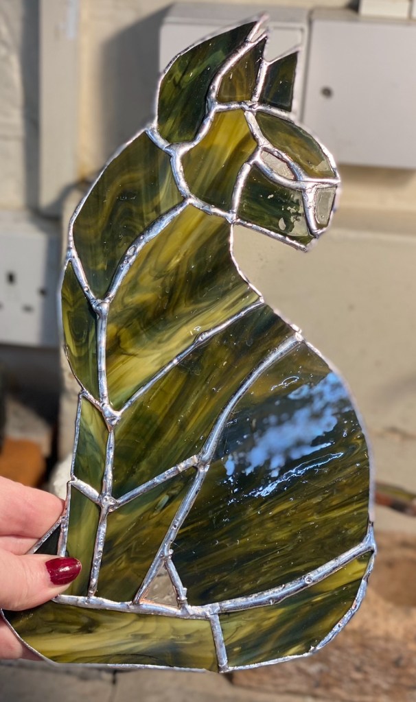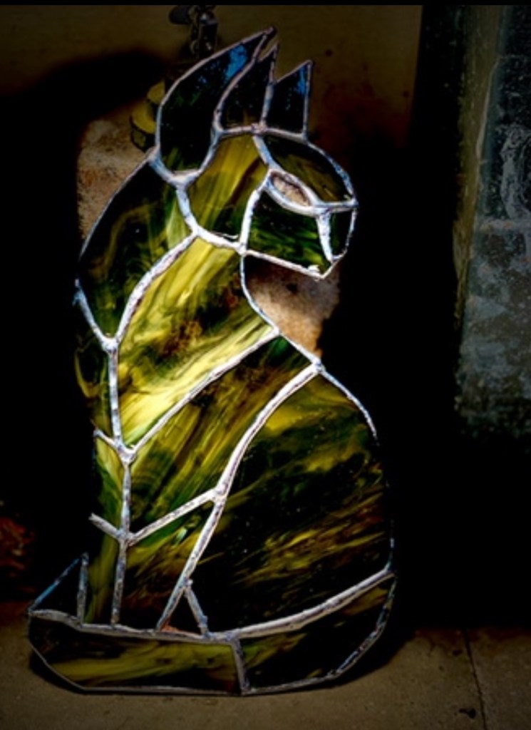 Every curve of this cat was cut by hand from iridescent green glass that shifts from emerald to amber as light moves across it. Each piece was wrapped in copper foil tape, soldered with precision for strength, and polished to a gleam. Her eyes catch a spark of life, and the flowing lines of her body give her a regal, standing pose – elegant yet wild, like a guardian of the night. Completely one‑of‑a‑kind, she glows with quiet confidence.