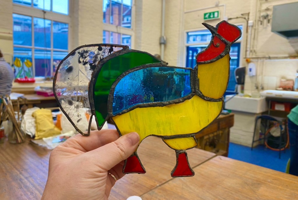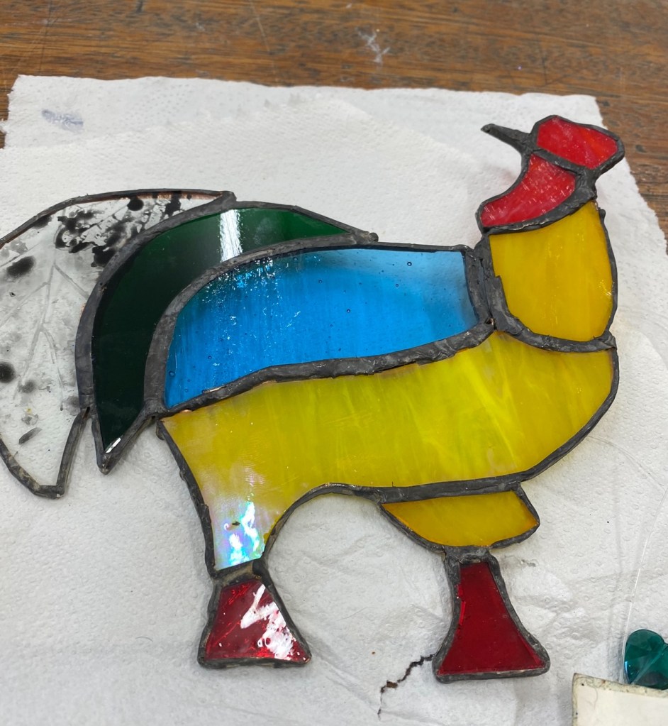 A bright, playful stained‑glass rooster made from bold blocks of yellow, red, blue and green. The chunky dark lines and simplified shapes give him a cartoon energy, as if he’s about to strut straight off the workbench and start singing.