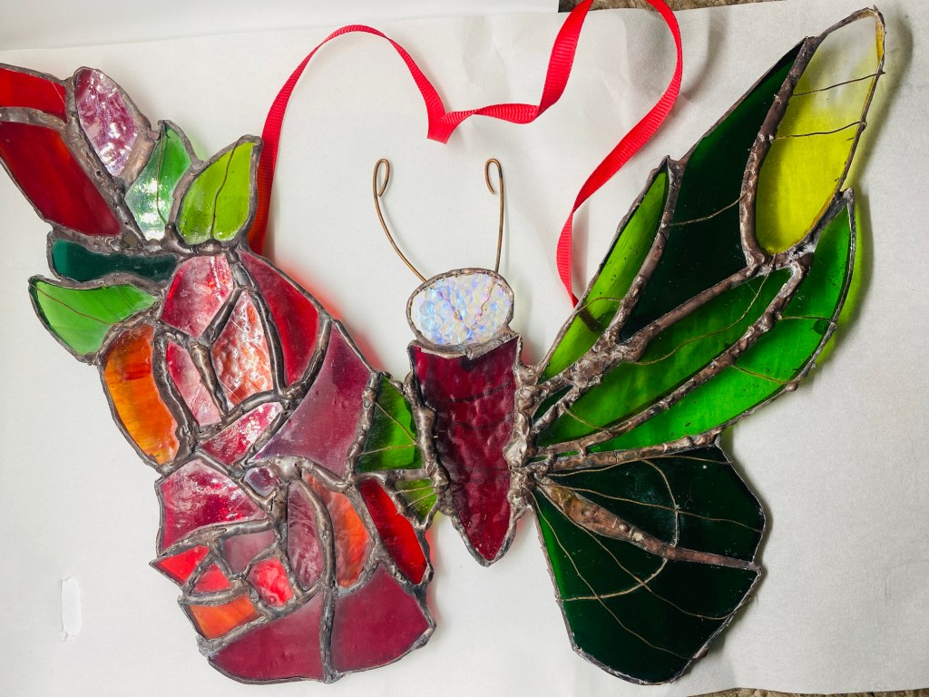 The butterfly’s journey from cocoon to flight mirrors our own changes – shedding the old to reveal something beautiful and free. I chose textured red and orange glass for the rose “cocoon,” green for leaves, and shimmering emerald‑yellow for wings that catch every ray of light. Each piece was meticulously wrapped in copper foil, soldered into a delicate balance, with wire antennae and a dreamcatcher bead at the heart. This is more than art; it’s a celebration of growth, perfect for reminding us that every ending blooms into wings.
