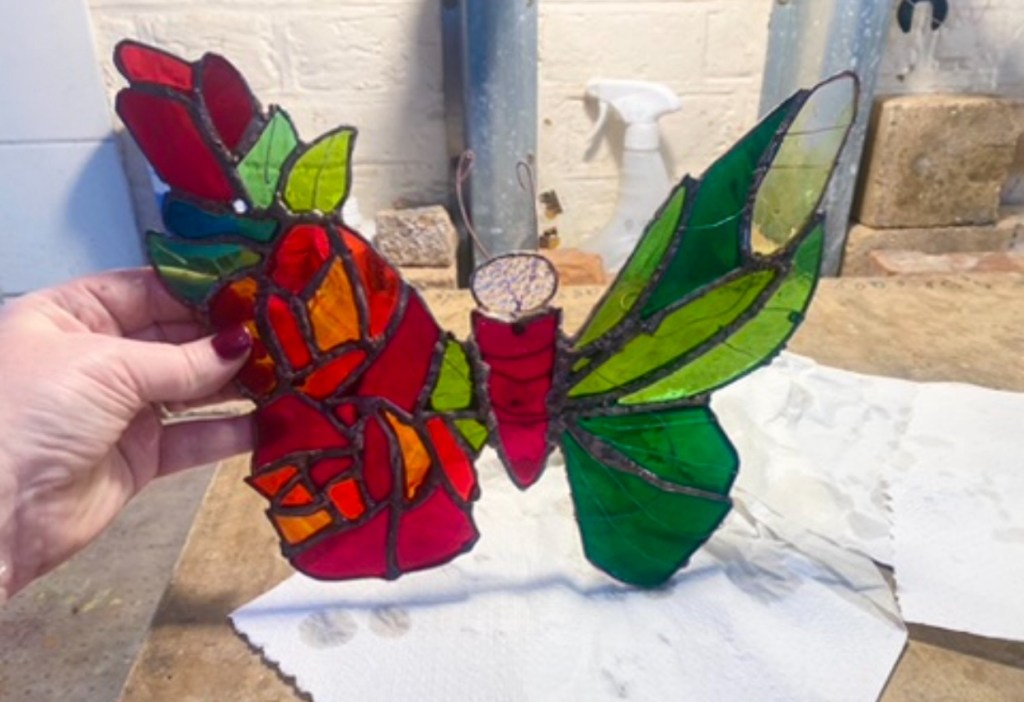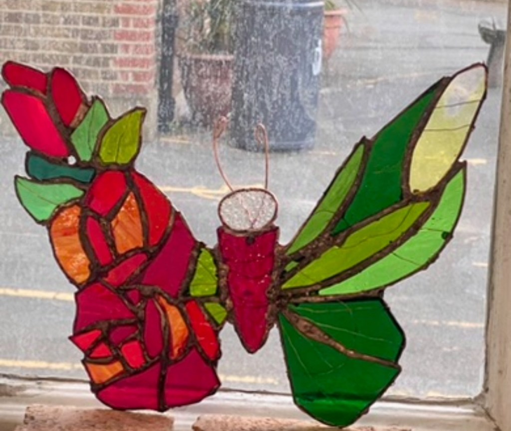 A wonderful butterfly emerging from roses, symbolising life’s most important process of transformation. Crafted with the copper foil technique for delicate wings and vivid petals.