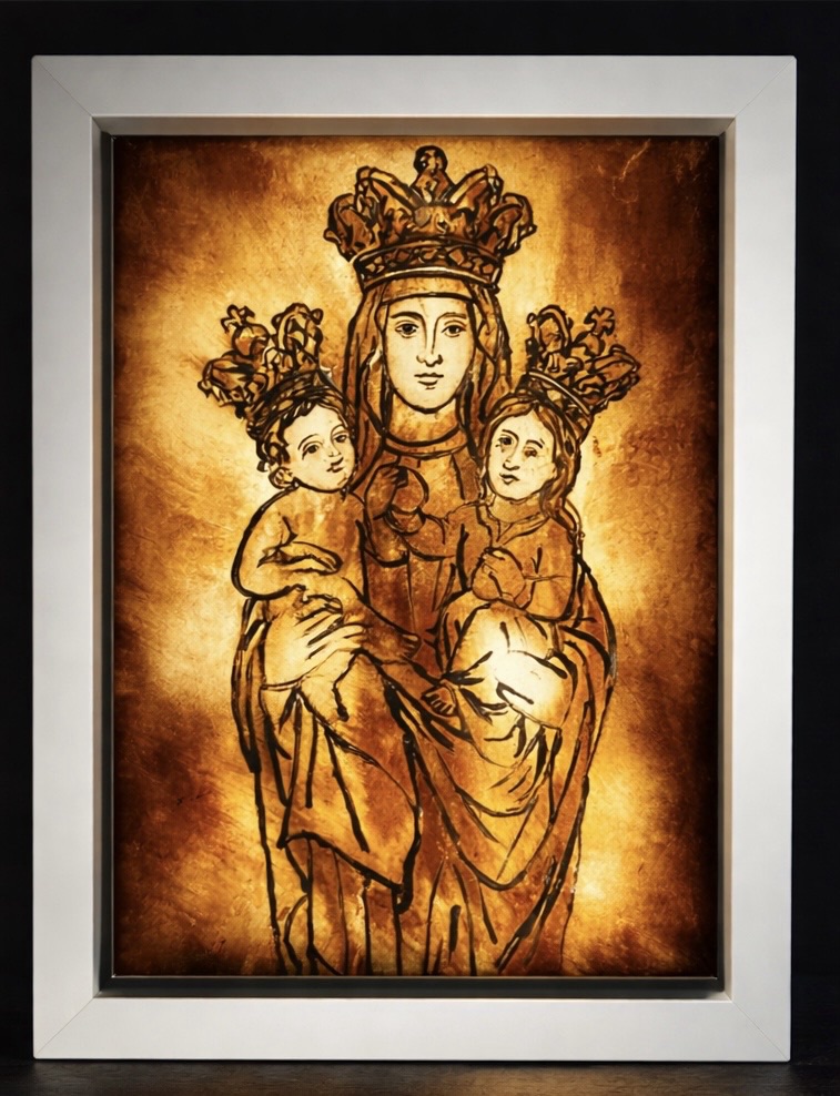 High on Mount Saint Anna, where mist clings to ancient stone, stands a humble sanctuary – a place of pilgrimage where seekers find silence and solace. I painted this using glass paints for the cool blues of the rocky slopes and warm umbers of the chapel walls, then applied silver stain that fires to shimmering gold for the glowing cross and haloed window. The jagged peaks frame the scene like protective arms, while a single ray of light pierces the clouds, symbolising divine presence amid nature’s grandeur. Assembled in a traditional lead frame, it captures that sacred moment when heaven touches earth – a personal retreat you can hang in your own home.