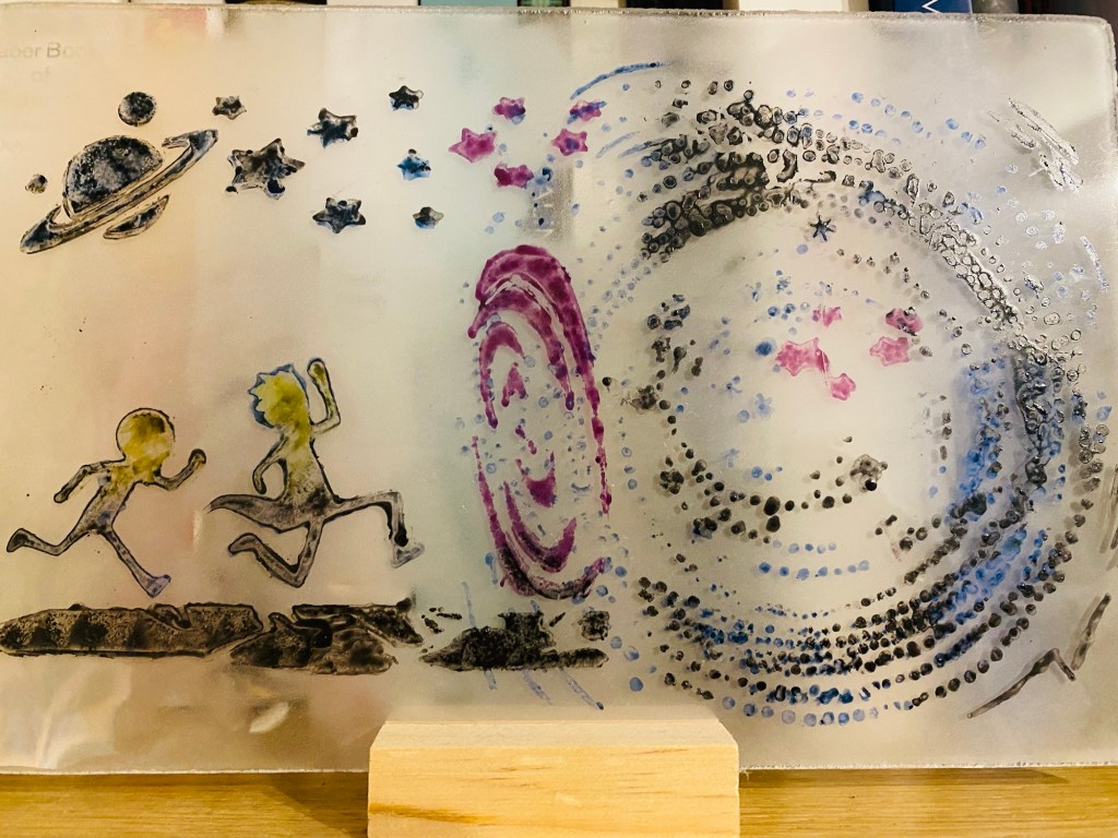An original kiln fired glass paint Tracing black, red, purple and blue pigment colours on glass and showing two yellow aliens racing towards a swirling purple‑blue portal surrounded by planets and stars. The loose, childlike lines and bright colours give it a sense of joyful, cosmic excitement.