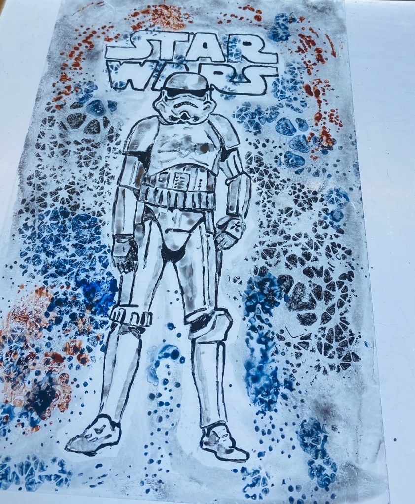 A hand‑stencilled Stormtrooper on wood, with “Star Wars” title in bold letters. Layers of white paint, blue and red splatters, and intricate stencils create a gritty, battle‑worn Imperial look.