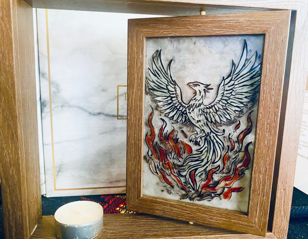 A powerful phoenix rising from flames, captured in glowing glass that transforms with light – white wings by day, emerald fire by night under UV. Symbol of rebirth, each piece is born through kiln flames, just like the phoenix itself.