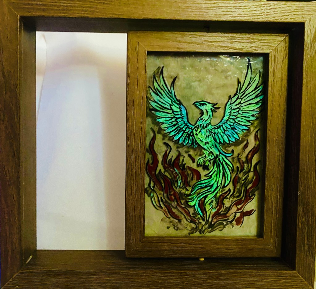 A powerful phoenix rising from flames, captured in glowing glass that transforms with light – white wings by day, emerald fire by night under UV. Symbol of rebirth, each piece is born through kiln flames, just like the phoenix itself.