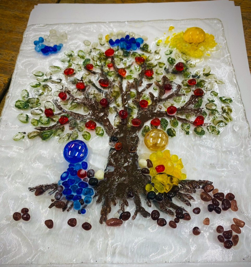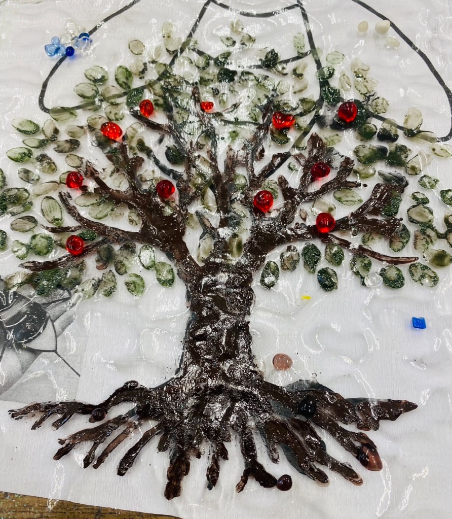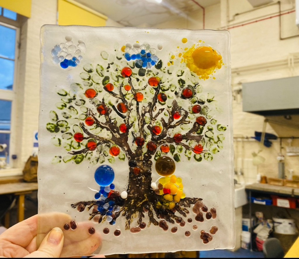 This work was made using glass paint and fusing – paint applied by hand, then fired in a kiln to melt into the glass forever. I started with a clear glass base, sketched the tree with its deep brown trunk and roots, then added the two figures: one blue, one yellow, sitting close at the base like young souls finding each other. Hundreds of tiny red glass beads became apples, green frit the leaves, and blue dots the sky. After painting, it went into the kiln at 650°C, where everything fused into a glowing, permanent scene. The title “Tree of Love – The Development of Two Souls” celebrates how love grows strong, like roots and branches reaching for the light.