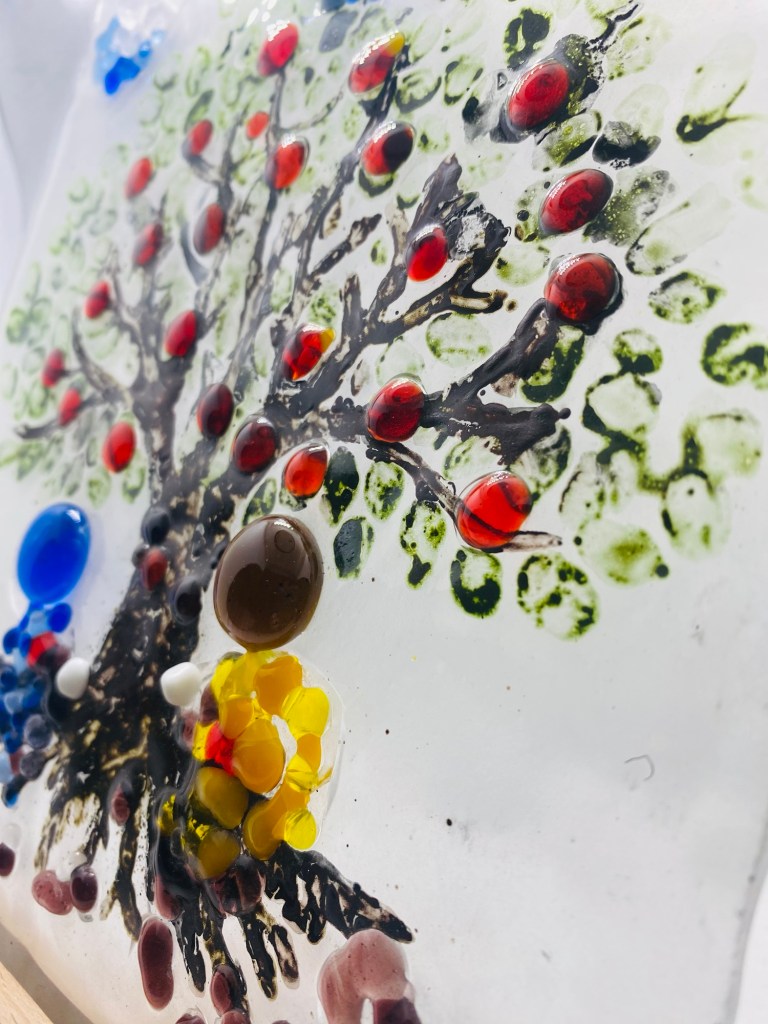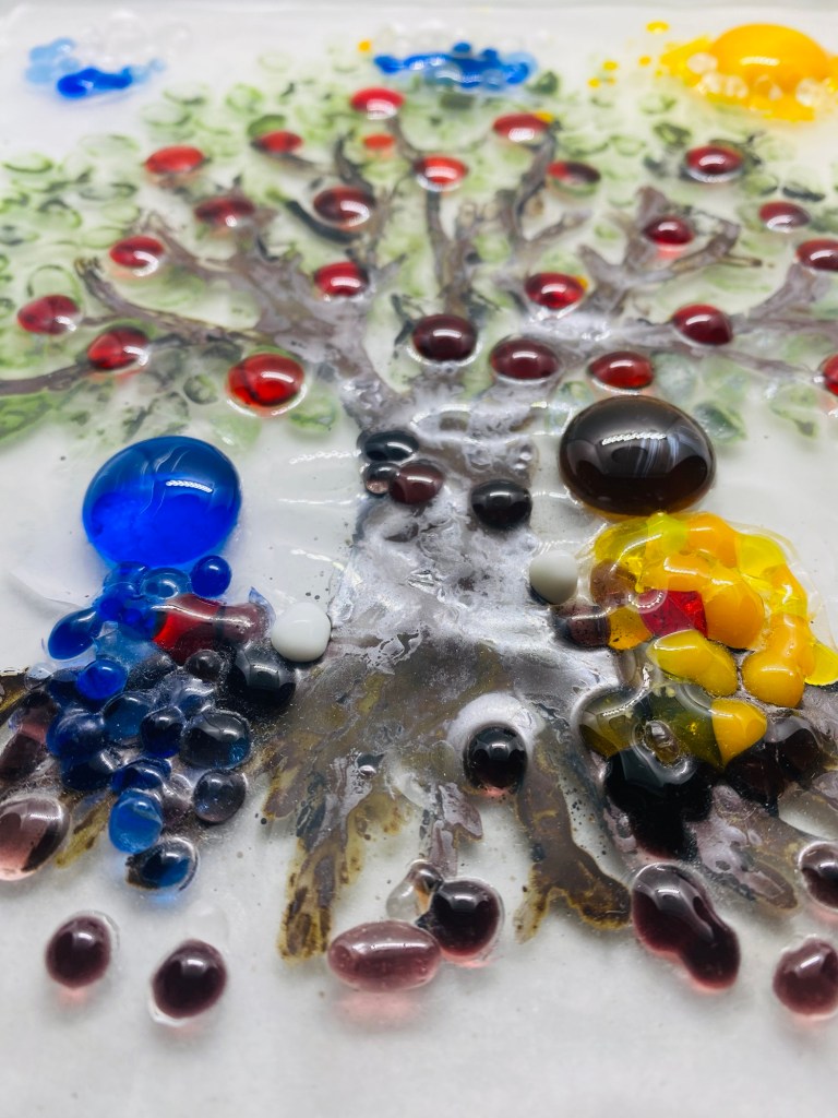 This work was made using glass paint and fusing – paint applied by hand, then fired in a kiln to melt into the glass forever. I started with a clear glass base, sketched the tree with its deep brown trunk and roots, then added the two figures: one blue, one yellow, sitting close at the base like young souls finding each other. Hundreds of tiny red glass beads became apples, green frit the leaves, and blue dots the sky. After painting, it went into the kiln at 650°C, where everything fused into a glowing, permanent scene. The title “Tree of Love – The Development of Two Souls” celebrates how love grows strong, like roots and branches reaching for the light.