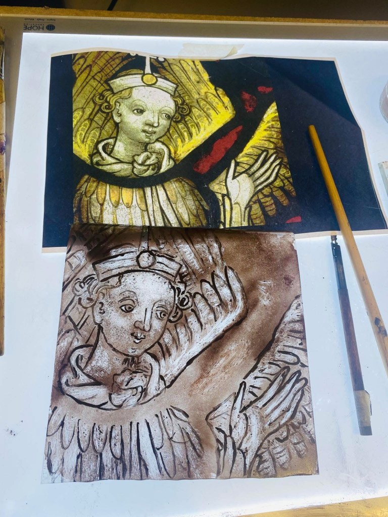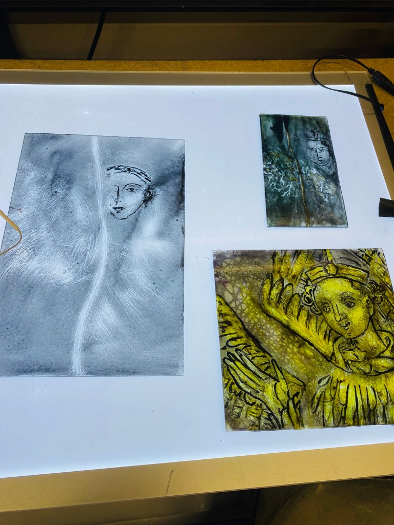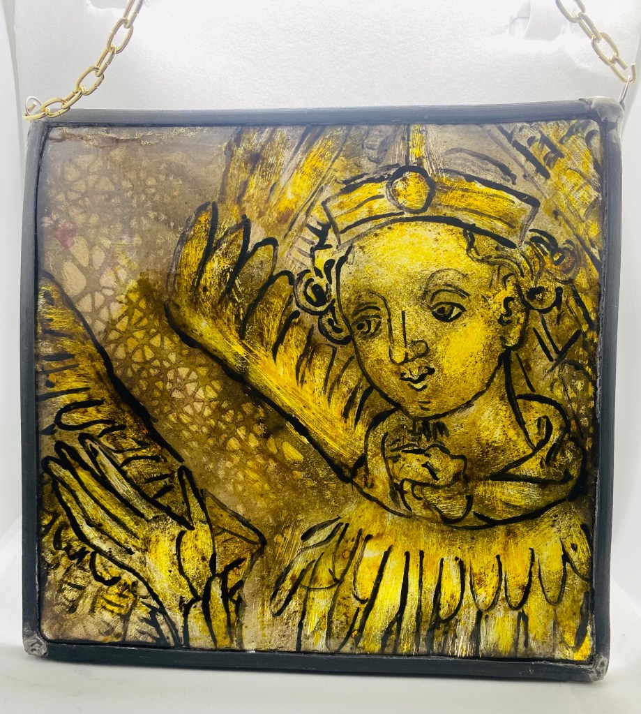Hand-painted glass artwork created using traditional tracing black for glass painting combined with silver stain gold. The surface is built through multiple manual processes including scratching, layering, and textural interventions to create depth and aged luminosity. Structural lead elements are integrated as both compositional lines and symbolic divisions, referencing classical stained-glass techniques while remaining contemporary in execution.