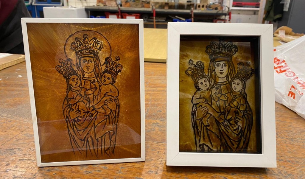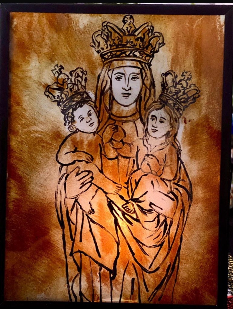 High on Mount Saint Anna, where mist clings to ancient stone, stands a humble sanctuary – a place of pilgrimage where seekers find silence and solace. I painted this using glass paints for the cool blues of the rocky slopes and warm umbers of the chapel walls, then applied silver stain that fires to shimmering gold for the glowing cross and haloed window. The jagged peaks frame the scene like protective arms, while a single ray of light pierces the clouds, symbolising divine presence amid nature’s grandeur. Assembled in a traditional lead frame, it captures that sacred moment when heaven touches earth – a personal retreat you can hang in your own home.