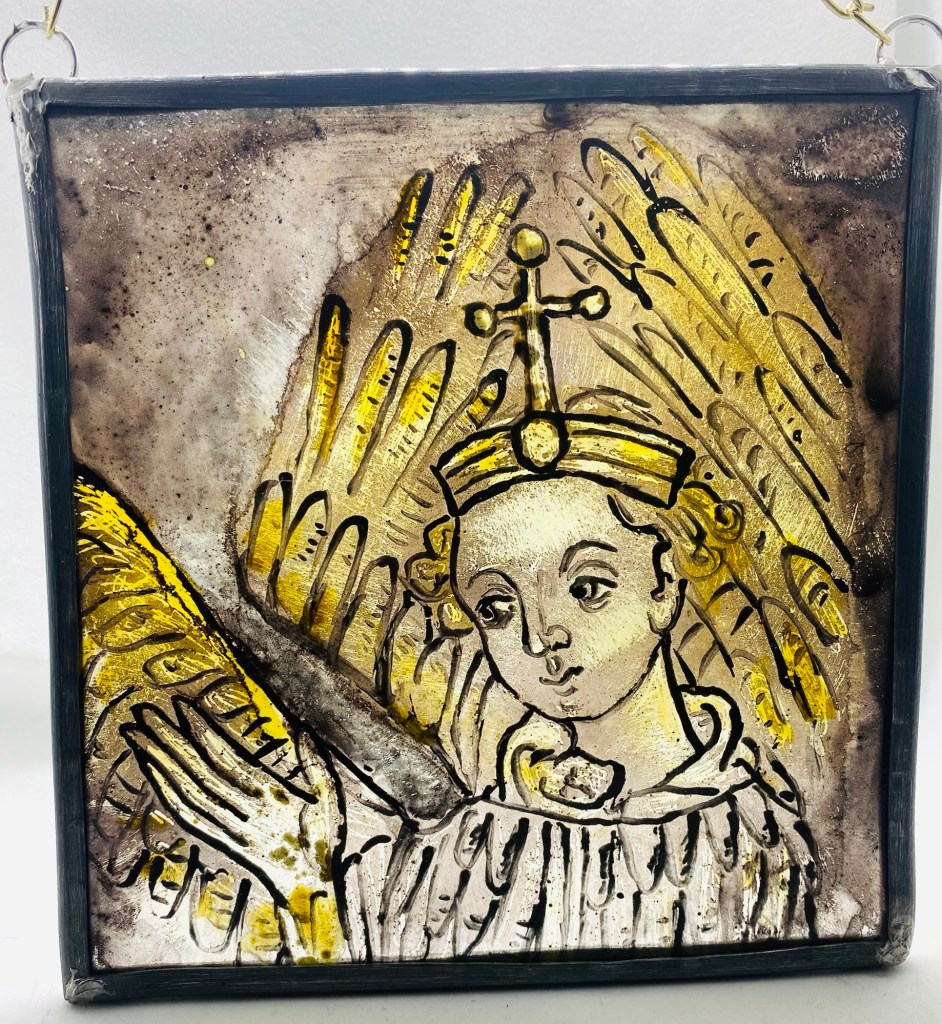 Mixed glass painting created using tracing black for glass and silver stain gold, developed through layered washes, scratching techniques, and controlled surface abrasion. The flat surrounding plane is intentionally treated differently to create atmospheric contrast and spatial depth. Linear elements act as visual passages, inspired by structural divisions found in stained-glass composition.