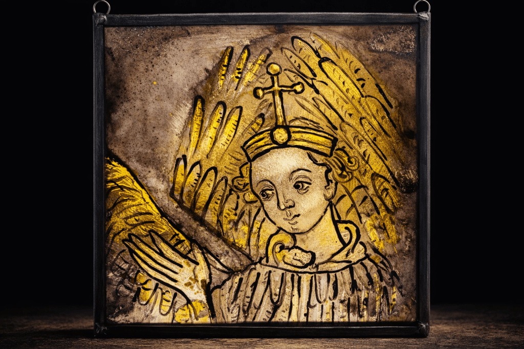 Mixed glass painting created using tracing black for glass and silver stain gold, developed through layered washes, scratching techniques, and controlled surface abrasion. The flat surrounding plane is intentionally treated differently to create atmospheric contrast and spatial depth. Linear elements act as visual passages, inspired by structural divisions found in stained-glass composition.