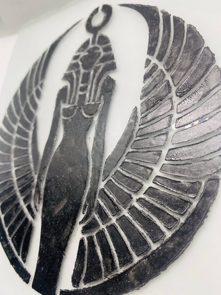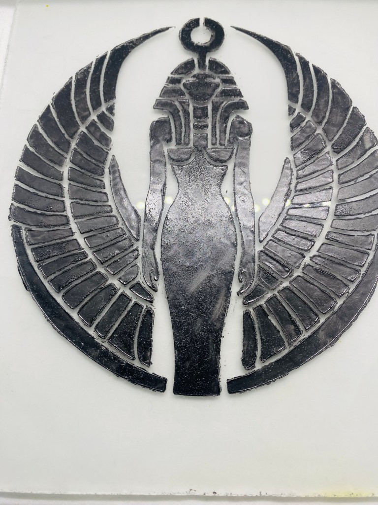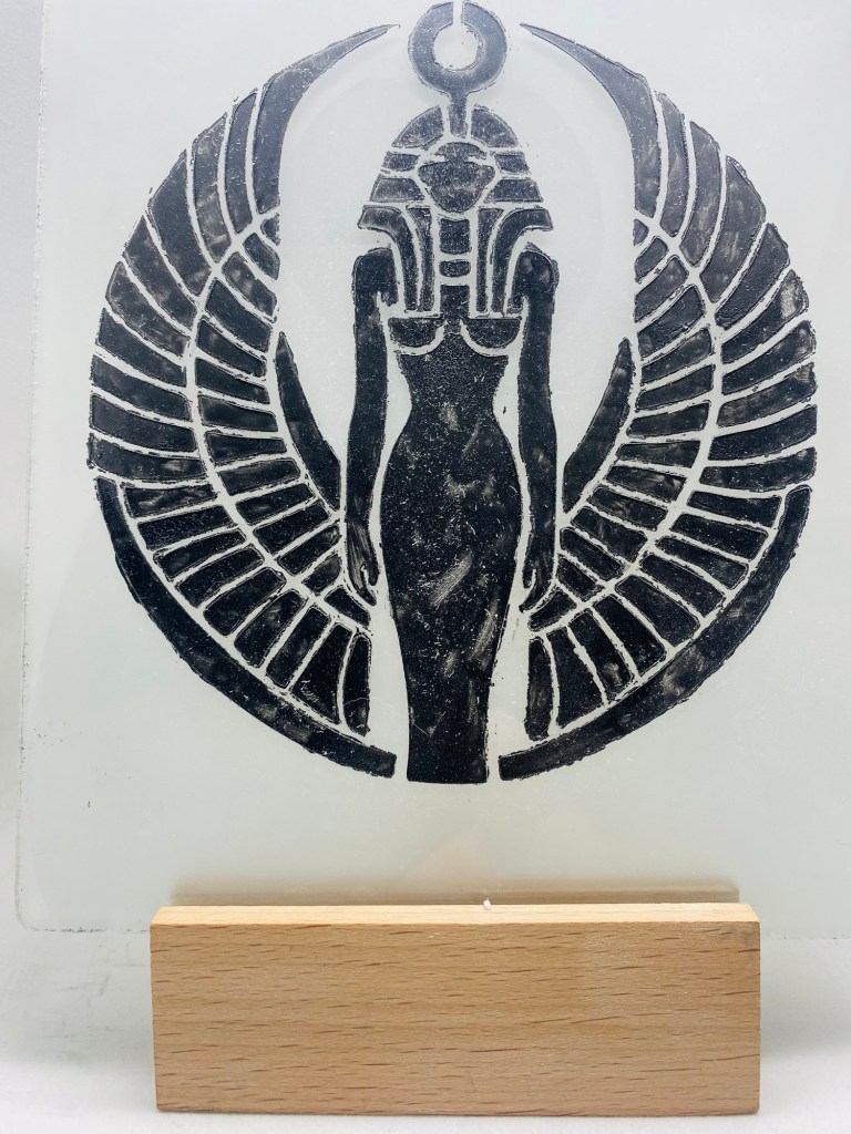 A powerful Isis (Egyptian goddess of magic and motherhood) stands tall with sweeping wings, her crescent moon crown and ankh symbol etched in stark black on frosted glass. The circular design feels ancient and protective, like a talisman.