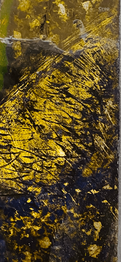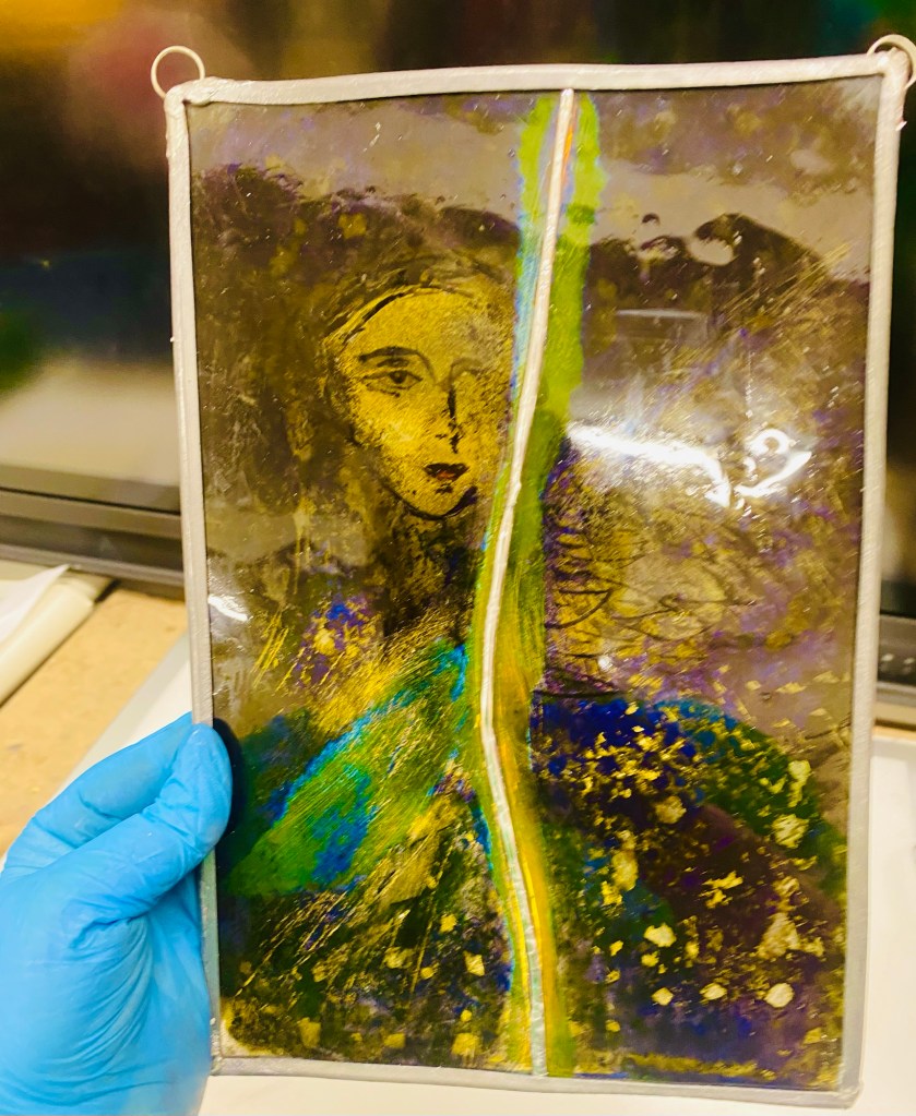 Hand‑painted glass panel created with multiple layers of silver stain and pigment, fired repeatedly to build depth, texture and metallic glow. Scratched and brushed marks are left visible as traces of the process, echoing the scars and memories that shape a human life.