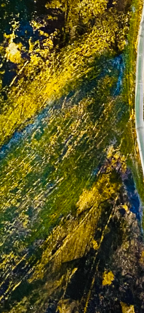 A narrow, shining path of light cuts through a landscape of deep golds and shadows. It is like a river seen from above, or a crack of dawn opening in the middle of night. This piece speaks about the soul’s journey: no matter how chaotic or dark the surroundings may seem, there is always a thin, steady line of direction inside us. When we listen to that inner line, life slowly turns from confusion into meaning, as if the whole field of experience begins to glow from within.