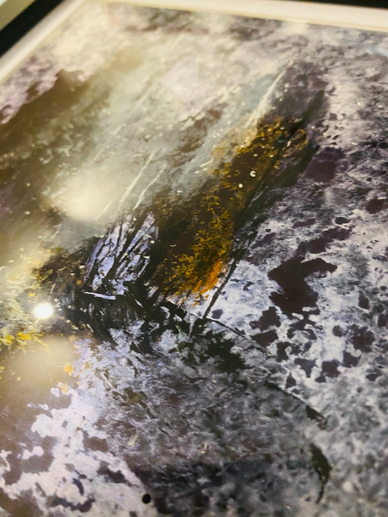From this concentrated shadow, vertical shafts of light rise, cutting through the gloom. They do not spread softly like a sunrise; they fall sharply, almost like blades or pillars, signalling a sudden interruption rather than a gentle transition. Psychologically, these vertical accents can be read as moments of insight that break through an old identity—a disruptive illumination that cannot be ignored. Just as the blinding light on the road to Damascus stops Saul in his tracks, the luminous streaks in your painting stop the eye, creating a tension between what is solid and what is dissolving.