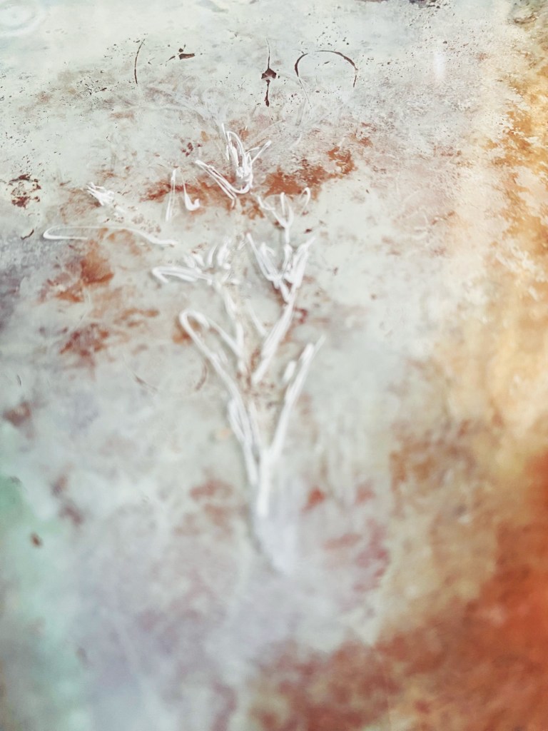 A quiet, feminine presence rises from this mist-filled landscape, like a memory returning with the first light of dawn. From soft veils of rust, rose, and pale green, a fragile luminous tree appears, suggesting a soul awakening after a long winter of silence. Its slender trunk and tender branches trace a path of inner growth – not sudden or dramatic, but patient, like sap slowly stirring beneath bark. The hazy atmosphere around it feels contemplative, inviting the viewer to pause, breathe, and listen to the subtle movements of the heart.