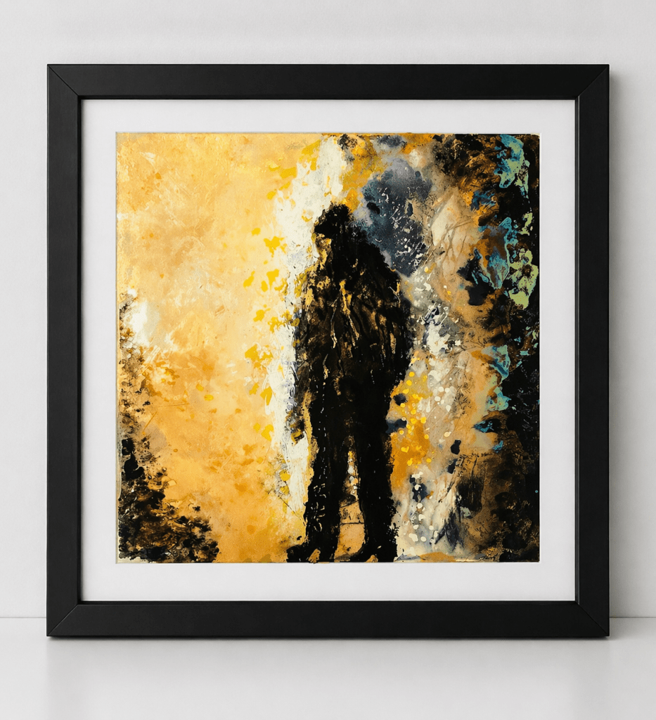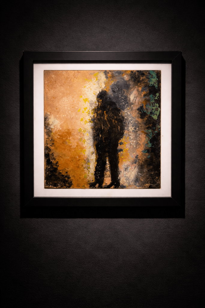 Emerging from layered textures of gold, ash, and shadow, the form resists definition. It is neither fully material nor entirely absent — suspended in a moment of transformation. The surface vibrates with tension: luminous fragments suggest awareness, while darker masses pull the figure back into obscurity.