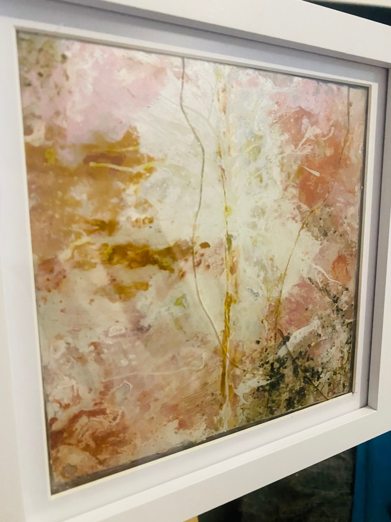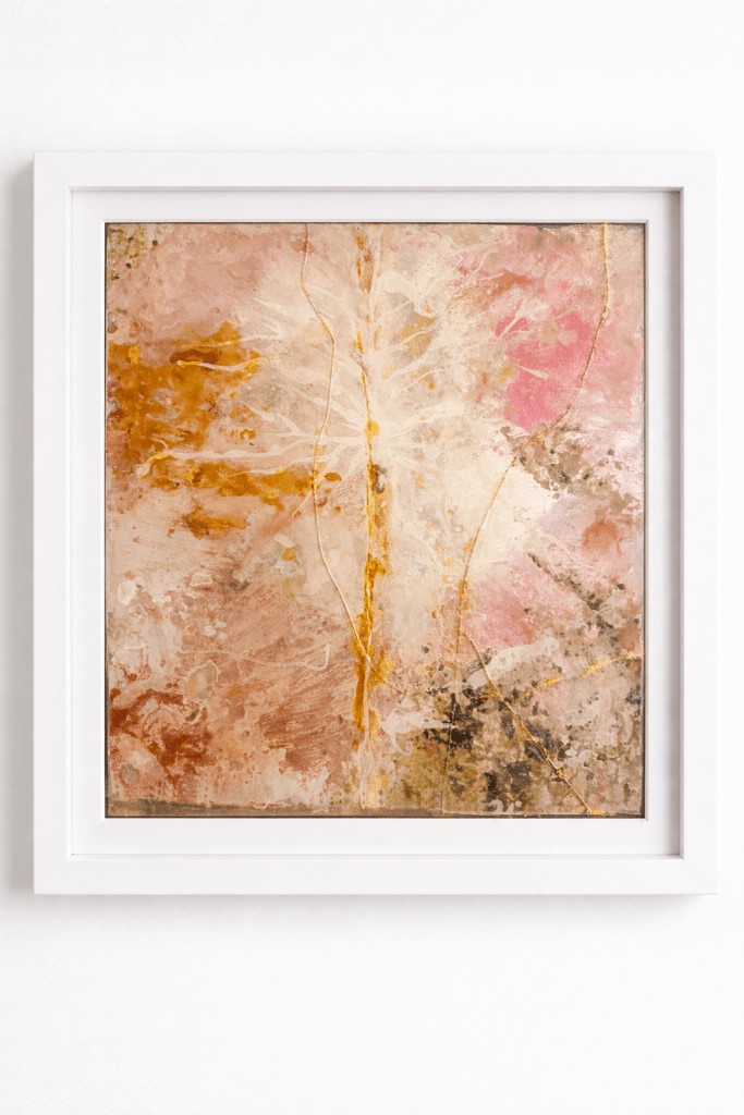 Soft fields of pink, mineral gold, and diffused textures shift across the surface, moving between presence and dissolution. The composition holds a delicate tension between density and openness, between what is breaking apart and what is still emerging.