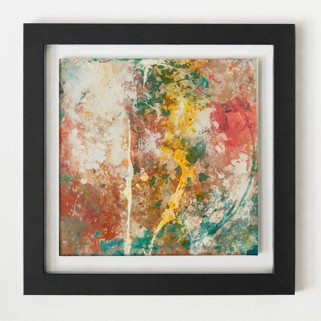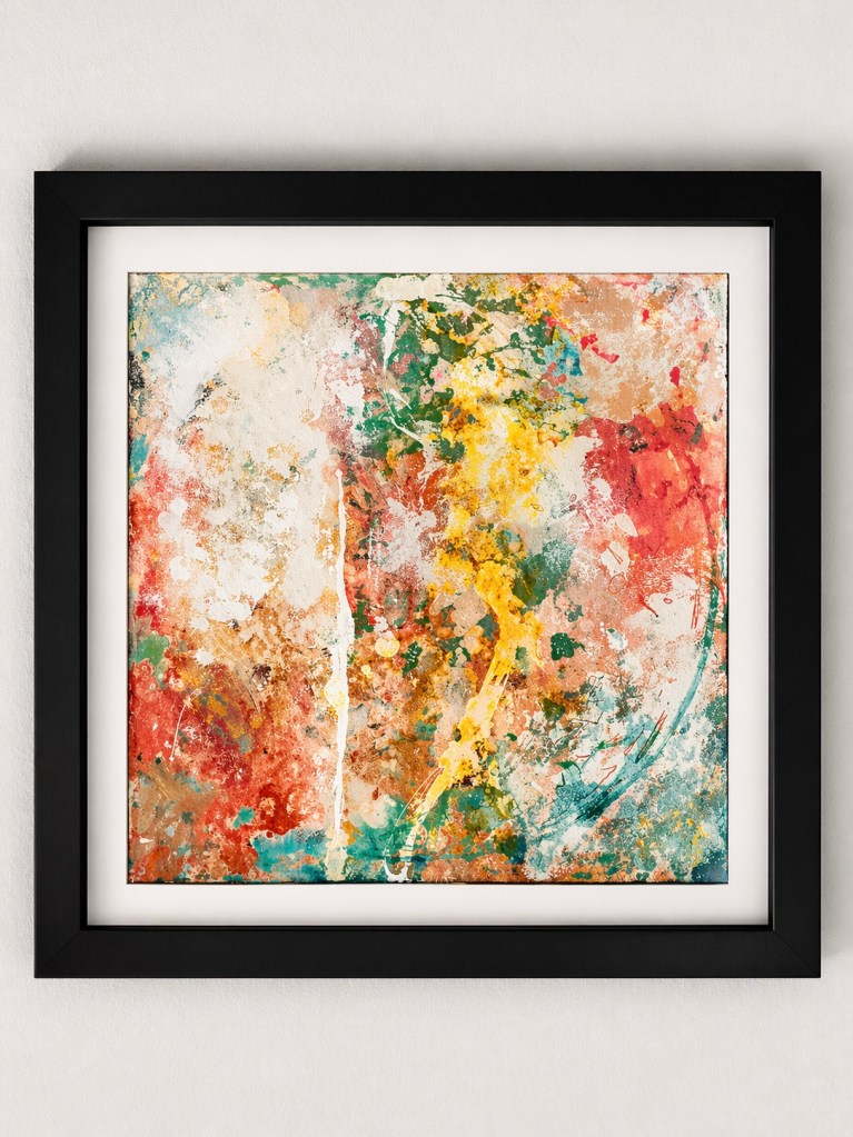 Across the surface, layers of pigment collide and disperse in a dynamic field of colour: mineral greens, oxidised reds, luminous yellows, and fragmented whites. The composition resists stability. Instead, it operates through tension — between density and openness, control and spontaneity.